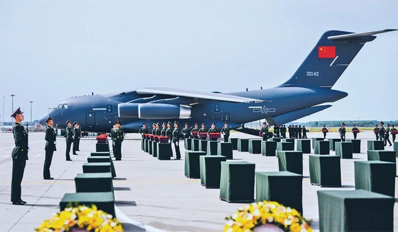 2025年9月12日,第十二批在韩中国人民志愿军烈士遗骸回国。图为当日,在沈阳桃仙国际机场,礼兵将殓放志愿军烈士遗骸的棺椁护送至棺椁摆放区。 新华社记者 潘昱龙/摄